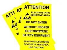 Yellow ESD awareness signs with bold black print, JEDC-14 (hand) symbol. Used for defining an ESD safe area and warning visitors and employees that they must be in compliance prior to entering the area. These ESD awareness signs feature a self adhesive backing and are available in packages of 5 each. Coated for added durability and fully compliant to the new ANSI ESD S20.20 requirements.