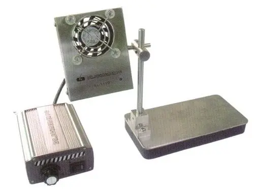 The SL-111D Bench Top ESD Ionizer consists of a stainless steel DC high output transformer coupled to a high efficiency stainless steel ionized air delivery system containing a 2″ fan and 4 emitter pins. The ionized air delivery unit mounts on a heavy duty stainless and composite stand.