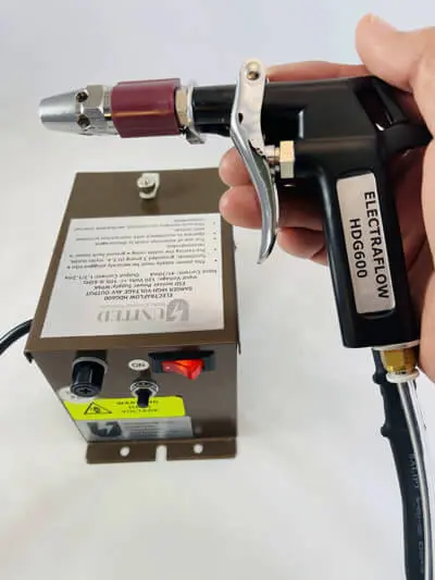 The HDG 600 is a robust and powerful handheld point-of-use ESD ionizer / static control air blower. This ionizer works in concert with clean compressed air to neutralize and remove static charged particulate making it easy to blow parts clean and control particle reattachment. The HDG 600 is perfect for providing a focused, controllable, cleansing and ionizing air stream to sensitive and delicate objects as well as larger assemblies and areas where electrostatic attraction causes contamination or handling problems. The HDG 600 is very popular for use in electronic and medical device manufacturing yet so well built it can handle the non-stop demands of assembly lines, pre paint applications, and more. How does the HDG 600 Work? The HDG 600 power supply transforms standard 120 VAC into a high voltage (4 KV) alternating current. This high voltage oscillating charge is directly coupled to the emitter pin located in the gun body nozzle. The outer portion of the nozzle is grounded via the high voltage cable. A current flows from the emitter pin to the earthed nozzle producing a balanced cloud of negative and positive ions. When the trigger is pressed a stream of compressed air passes thru this cloud, ionizing the air and neutralizing the static charge on an item placed in the stream. Please Note: This item is NOT for use in flammable or explosive environments. The compressed air supplied to the unit must be clean and dry. Our 3 year warranty does not cover damage caused by moist or dirty compressed air.