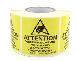 These bright yellow and black self adhesive esd awareness labels conform to MIL STD 129N, SYMBOL B627 and are designed to call immediate attention to items that are susceptible to damage from an electrostatic discharge (an esd event). We provide these in 4 sizes with a permanent adhesive backing. The labels are coated for added durability and resistance to water, moisture and many common chemicals. These labels further conform to the new ANSI ESD S20.20 requirements that ESD sensitive assemblies should be provided with a visible ESD susceptibility symbol.